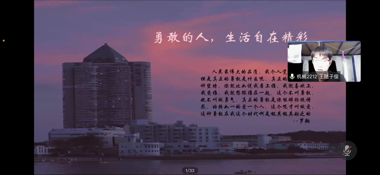 活动共选出50件作品参与线上评选,参赛同学以“寻求文字之魅力”为主题分享了一段对自己感悟极深,对自己人生产生极大影响的文字,做3-5分钟的演讲展示。社团工作人员根据参赛同学的主题思想表达、制作技巧水平、创新创意设计等多个方面进行评选,最终评选出一、二、三等奖。