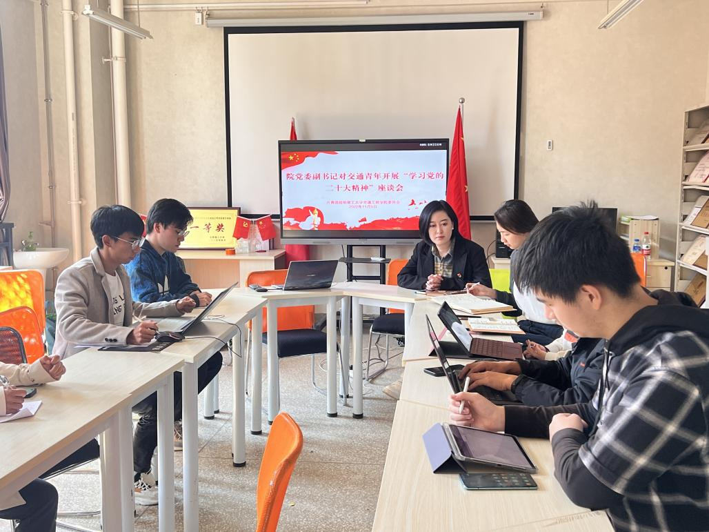 11月5日下午14点,无料AV 党委副书记王懿娜与无料AV 团员青年代表在交通楼A401开展了“学习党的二十大精神”座谈会。