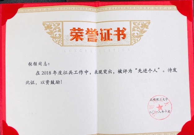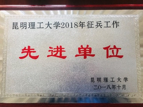 2018年兵工作“先进单位”表彰,党委副书记张强同志荣获征兵工作“先进个人”称号,学工办主任王懿娜同志荣获校级“优秀辅导员”称号、征兵工作“先进个人”称号。